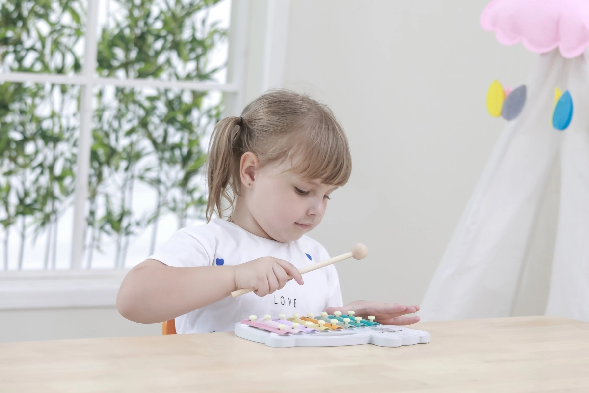 Osiem pastelowych klawiszy zachęca dzieci do odkrywania tonów, rytmu i prostych melodii. Idealny do rozwoju percepcji słuchowej i kreatywności.