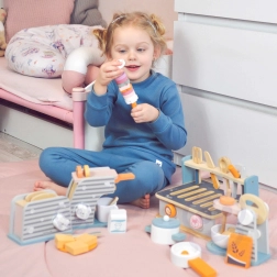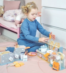 Elementy interaktywne, takie jak obrotowe pokrętła i para płyt grzewczych, dodają gotowaniu realizmu i motywują dzieci do dłuższej, bardziej skupionej zabawy.