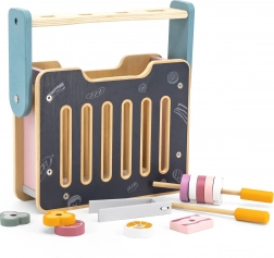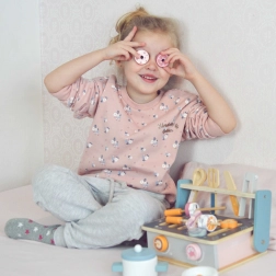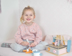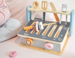 Ta stylowa drewniana kuchnia 2w1 łączy klasyczne gotowanie z grillowaniem. Dzięki składanej konstrukcji łatwo dopasujesz ją do przestrzeni i preferencji małego kucharza. Dwie płyty grzewcze z obrotowymi pokrętłami nadają zabawie realizmu, a dzieci ćwiczą małą motorykę i wyobraźnię.