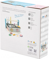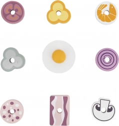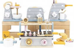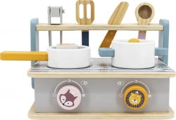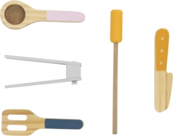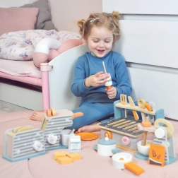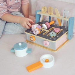 W zestawie jest wszystko, czego potrzeba do pierwszych przepisów: dwa garnki i podstawowe przybory (nóż, łyżka, łopatka, szczypce), patyczki do szaszłyków oraz drewniane produkty, takie jak mięso, jajka i warzywa. Kolorowe wykonanie zachęca do zabawy i wspiera rolę małego kucharza.