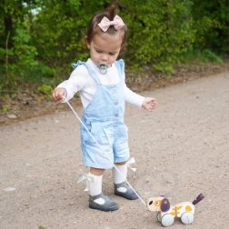 Uroczy drewniany piesek na sznurku wspiera pierwsze kroki, rozwija małą motorykę i koordynację, a dzięki gumowym kółkom o cichym biegu idealnie sprawdza się w mieszkaniu. Ze sznurkiem do prowadzenia i radosnym merdającym ogonkiem to świetny prezent dla małych odkrywców.