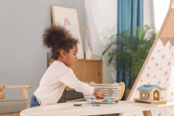 Wysokiej jakości drewno, zaokrąglone krawędzie i przyjemne kolory zapewniają bezpieczną zabawę nawet dla najmłodszych. Idealna do pokoju dziecięcego i w podróż.