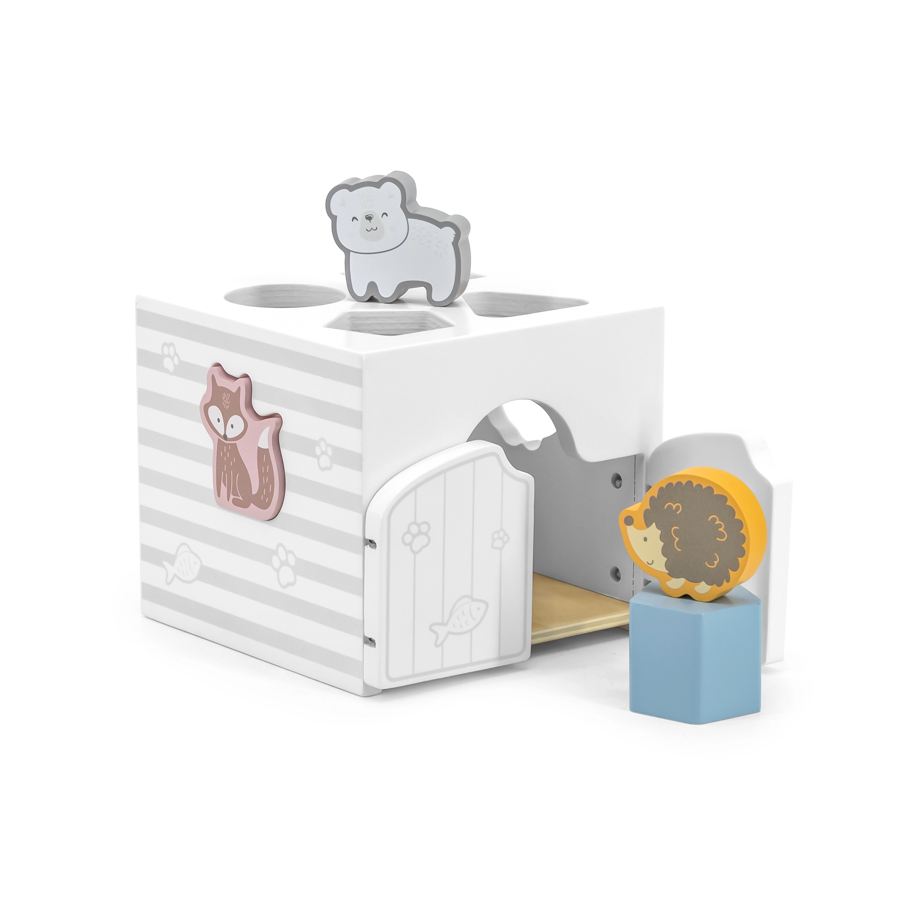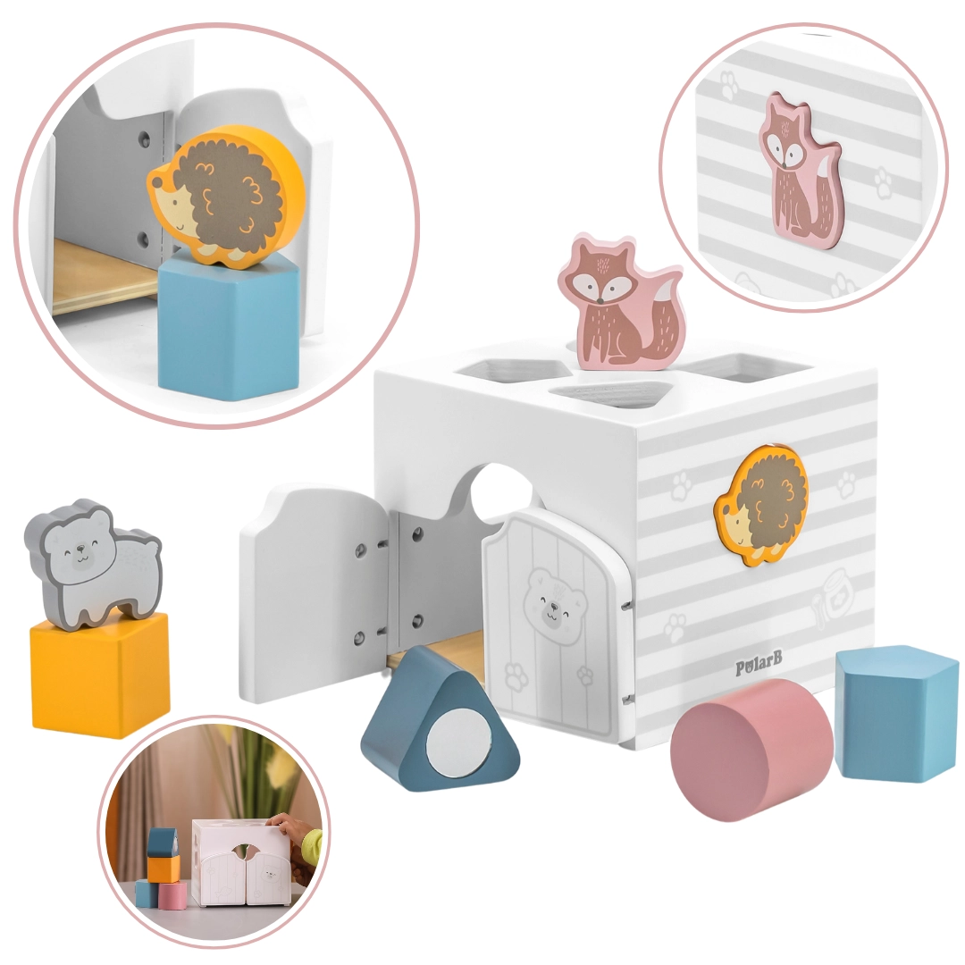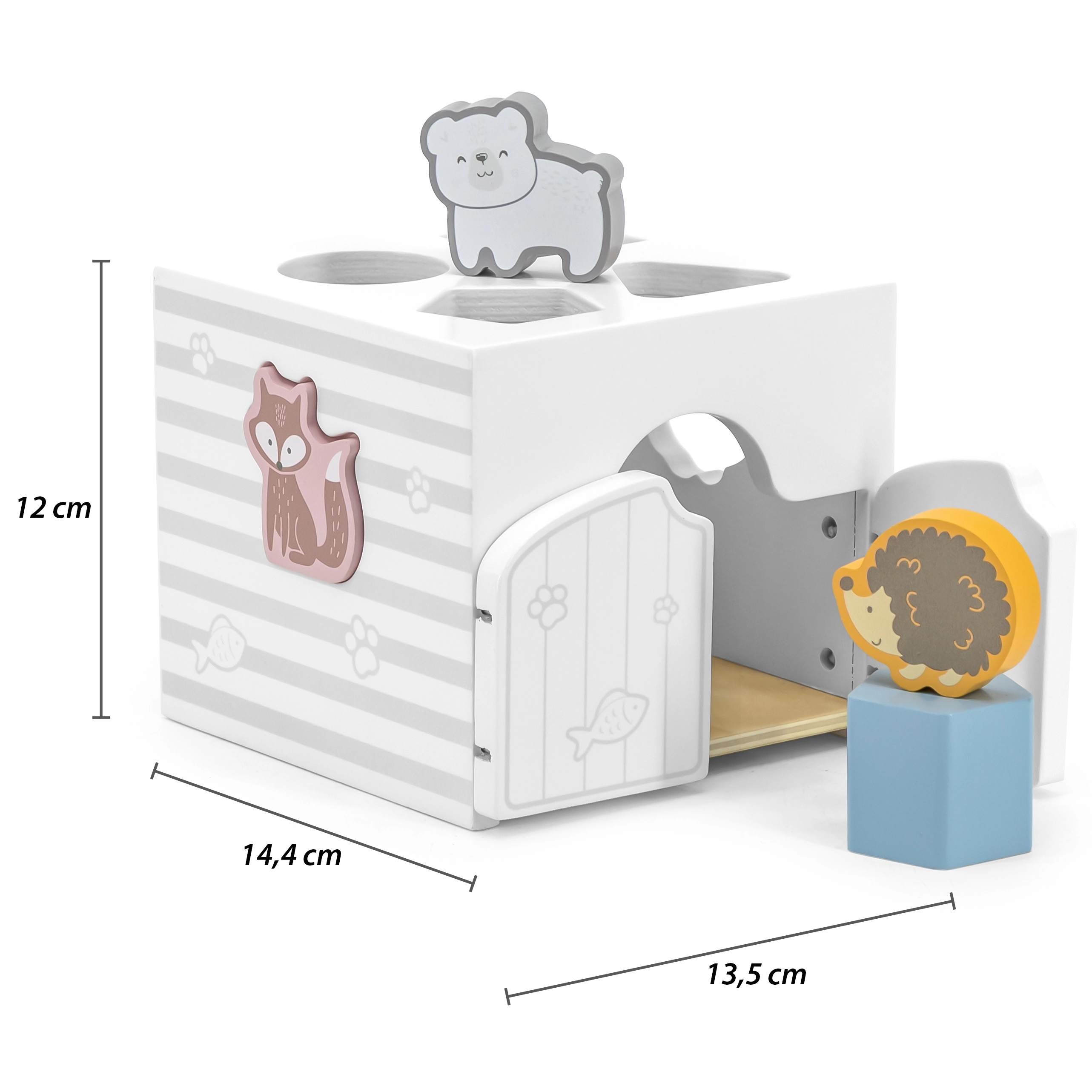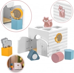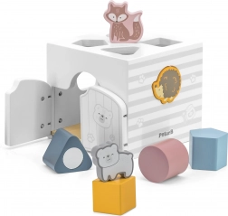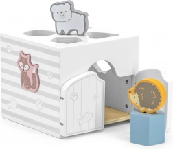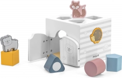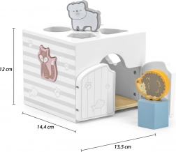 Drewniana układanka ze zwierzątkami. Klocki grzechoczą. Wymiary układanki ok. 13,5 × 12 × 14,4 cm. Wymiary opakowania ok. 15 × 14,5 × 13 cm. Wiek 18 m+.