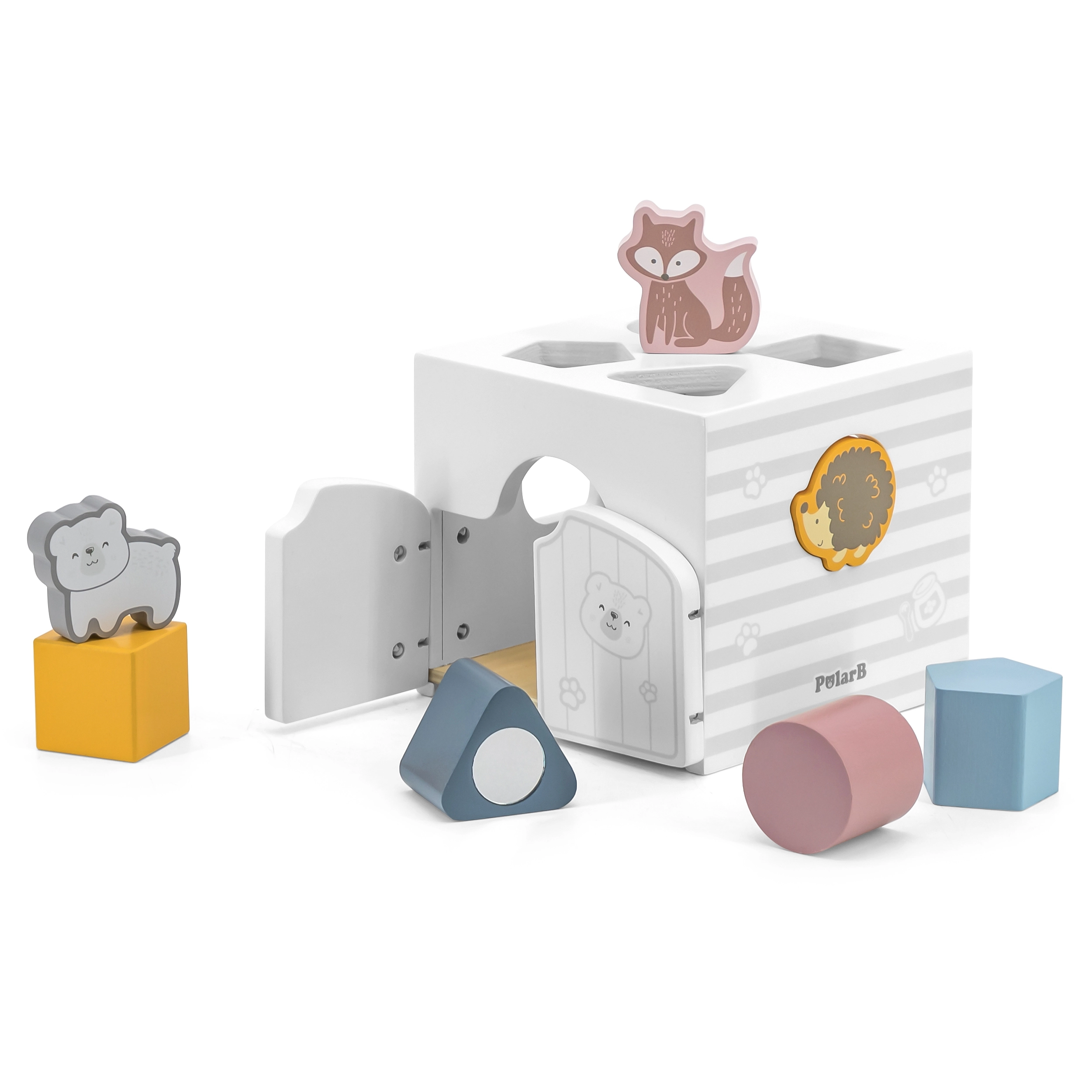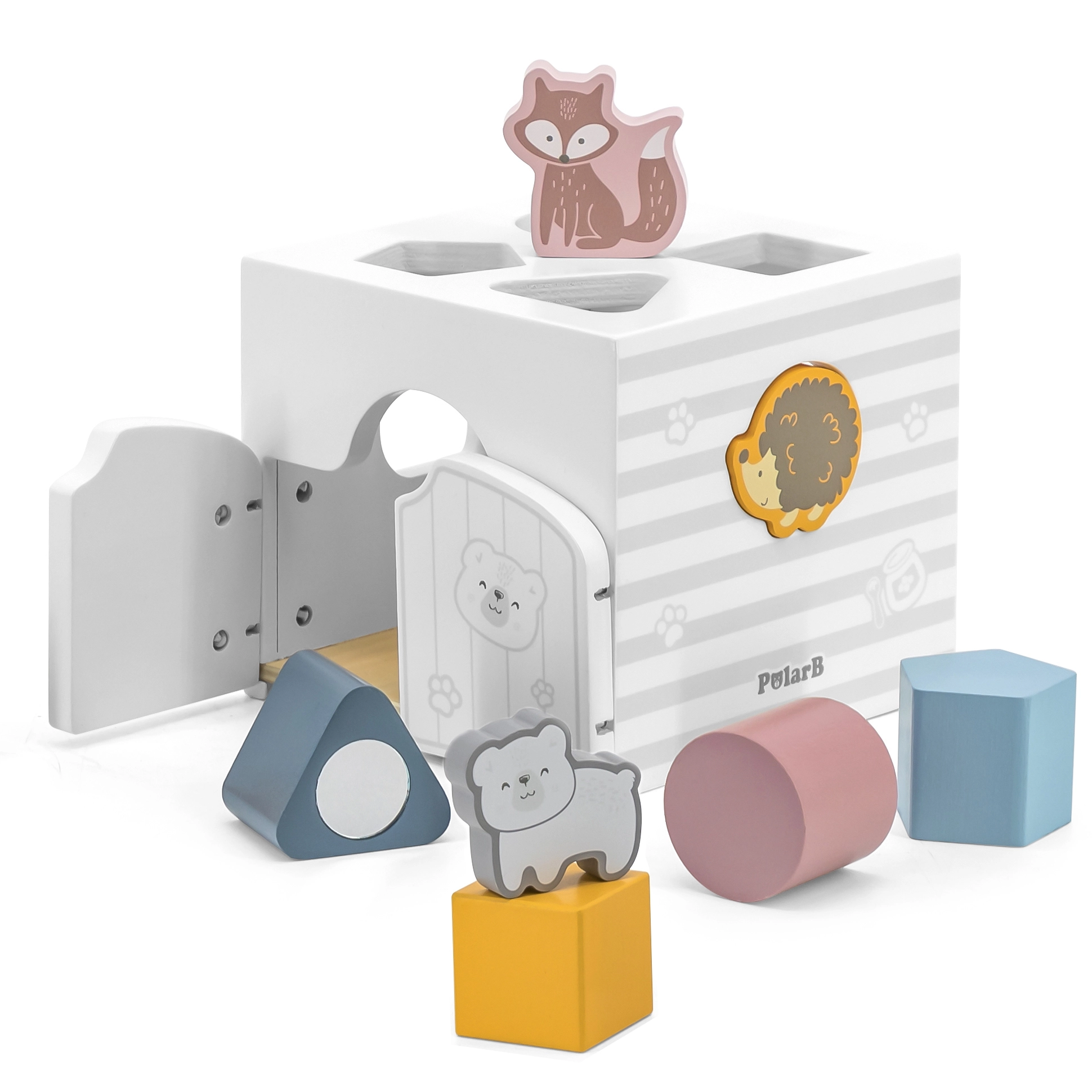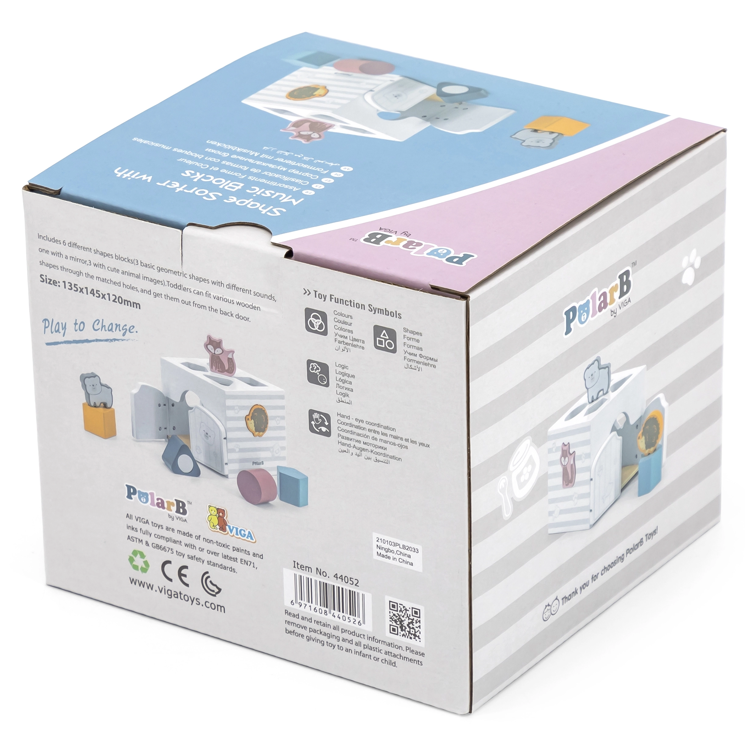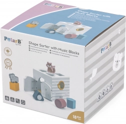 Drewniana układanka ze zwierzątkami. Klocki grzechoczą. Wymiary układanki ok. 13,5 × 12 × 14,4 cm. Wymiary opakowania ok. 15 × 14,5 × 13 cm. Wiek 18 m+.