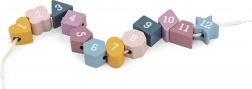 Każdy element ma otwór do przewlekania sznurkiem – trenuje chwyt, koordynację ręka–oko i cierpliwość.
