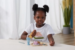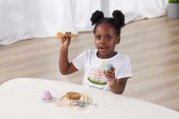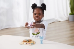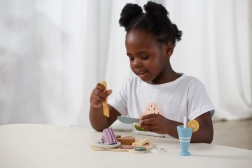 Kolorowe kawałki jedzenia, deser i napój pozwalają dzieciom serwować obiad jak naprawdę i ćwiczyć podstawy nakrywania do stołu.