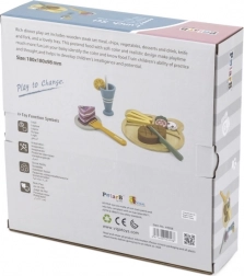 Dzięki solidnemu drewnu i wysokiej jakości wykonaniu zestaw jest odporny na codzienną zabawę. Odpowiedni do dziecięcej kuchni, kącika zabaw i w podróży. Zabawa produktami spożywczymi wspiera naukę kolorów, kształtów i podstawowych zasad nakrywania do stołu.