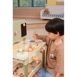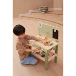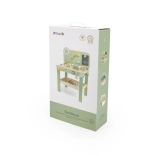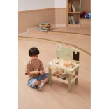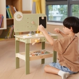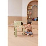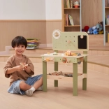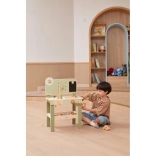 Stylowy dziecięcy warsztat w naturalno-zielonej kolorystyce oferuje realistyczne doświadczenie pracy w warsztacie w bezpiecznej, drewnianej formie. Dzieci mogą przykręcać, wymieniać kółka w autku, „ciąć” elementy, składać koła zębate i odkrywać zasady przyczyny i skutku. Dzięki przejrzystej przestrzeni do przechowywania wszystkie elementy i narzędzia są zawsze pod ręką.