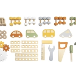 - Warsztat, narzędzia, śruby i nakrętki, drewniane listwy, koła zębate, autko, zegar z wskazówkami