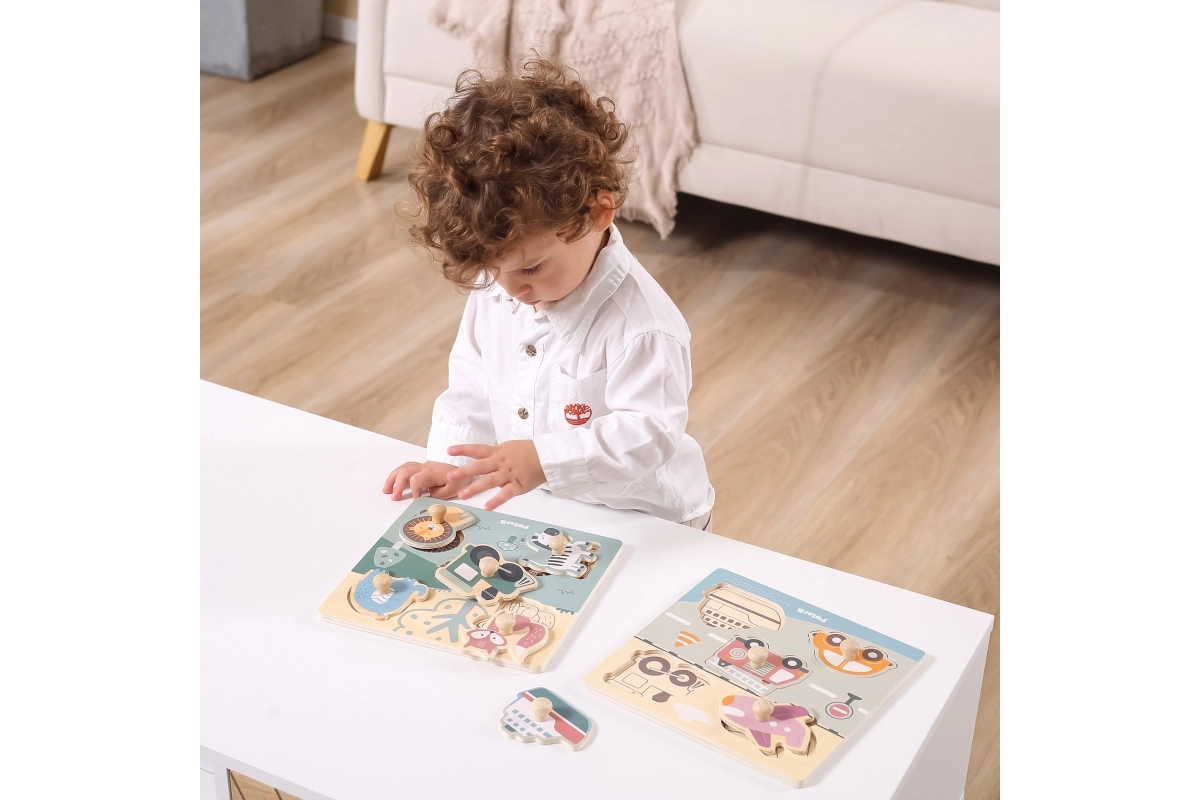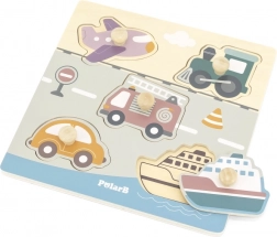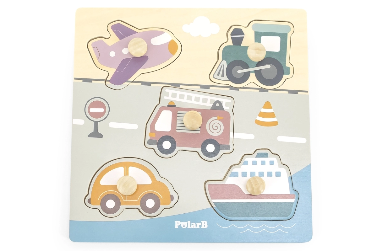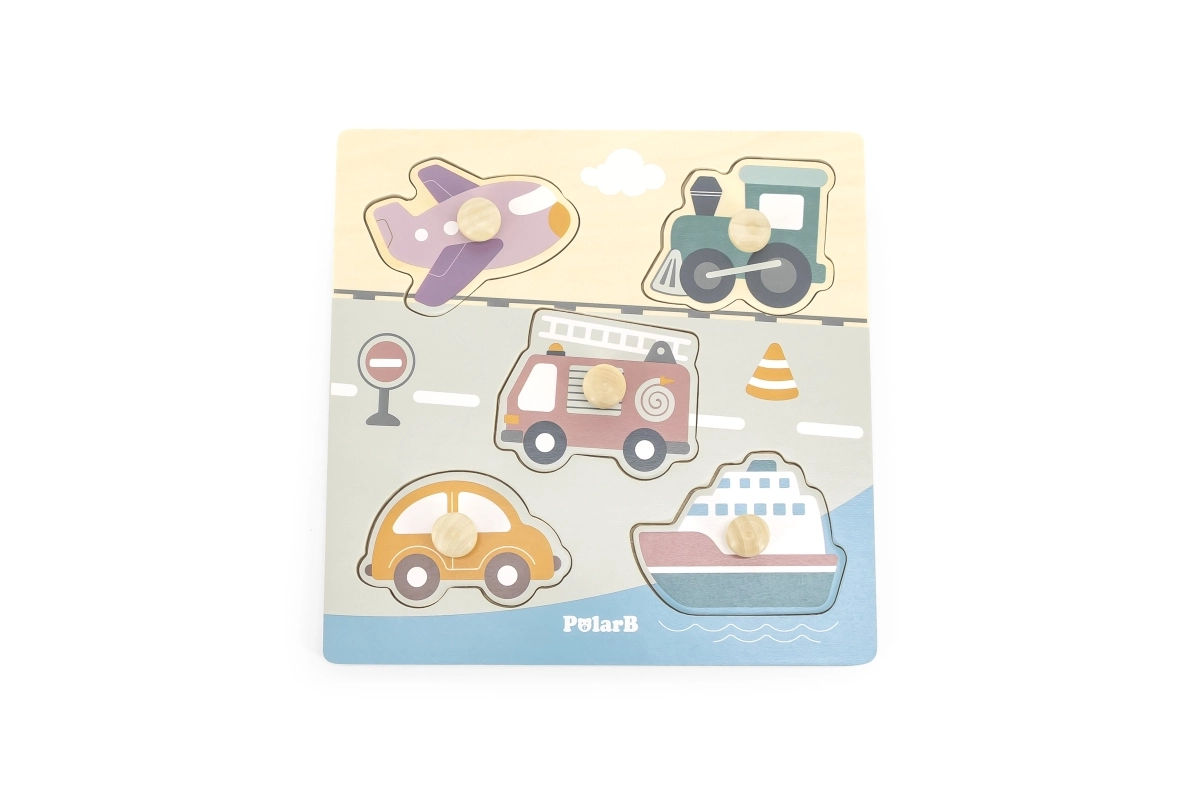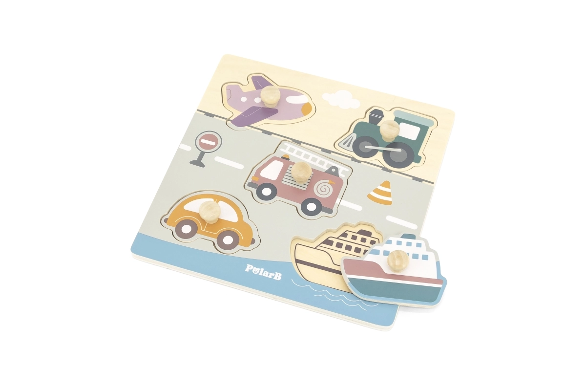 Drewniana układanka z motywem środków transportu. Wymiary drewnianej planszy ok. 22 × 22 cm. Wymiary opakowania ok. 22 × 22 × 2,5 cm. Wiek 18 m+