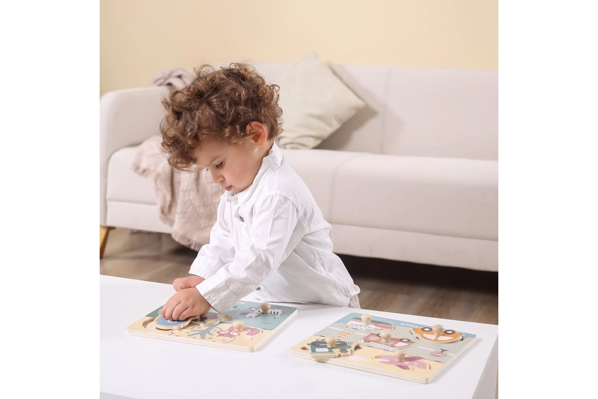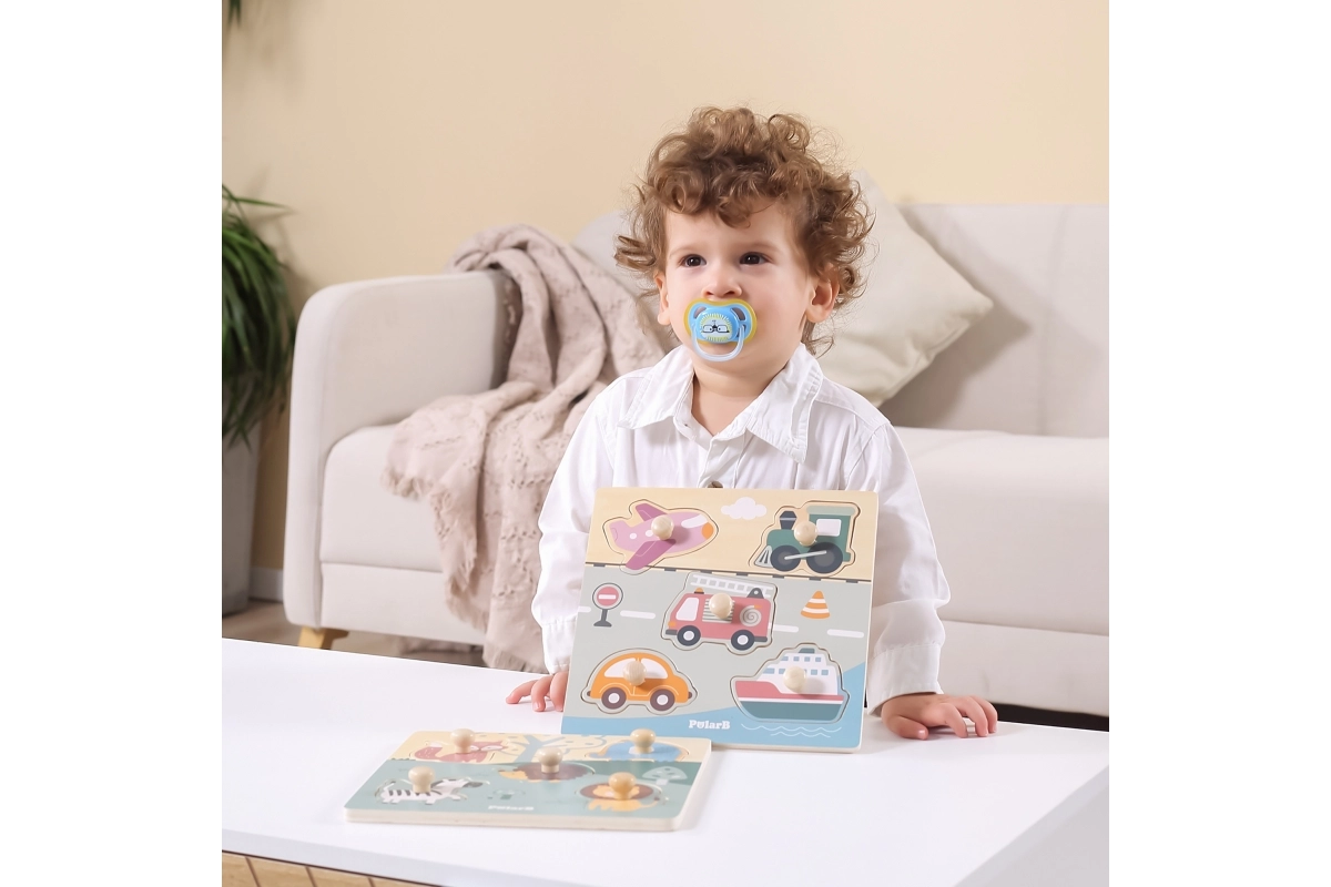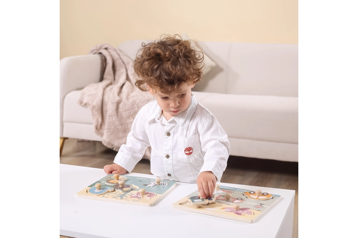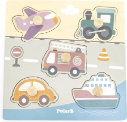 Drewniana układanka z motywem środków transportu. Wymiary drewnianej planszy ok. 22 × 22 cm. Wymiary opakowania ok. 22 × 22 × 2,5 cm. Wiek 18 m+