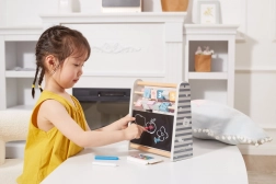 W zestawie znajduje się mała tablica oraz bezpyłowa kreda do pisania cyfr, pierwszych działań i własnych obrazków – idealna do rozwijania kreatywności.