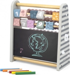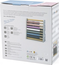 To wielofunkcyjne drewniane liczydło 3 w 1 łączy naukę i zabawę w jedno. Dzieci dzięki kolorowym koralikom ćwiczą liczenie, z przekręcanymi kostkami z cyframi uczą się rozpoznawania cyfr i prostych zależności, a na tablicy kredowej mogą pisać i rysować swoje pierwsze działania oraz obrazki.