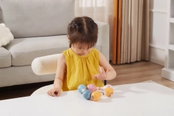Stylowa i bezpieczna grzechotka w kształcie podwójnych marakasów wykonana jest z wysokiej jakości drewna i zaprojektowana tak, by wydawać delikatny, kojący dźwięk przyjemny dla dziecięcych uszu. Niska waga zachęca dzieci do częstego chwytania i potrząsania, dzięki czemu naturalnie rozwija się motoryka mała, rytm i koordynacja.
