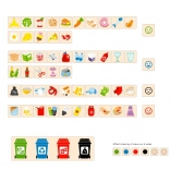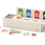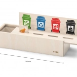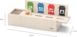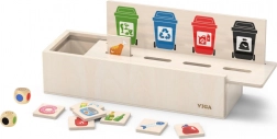 Ta edukacyjna zabawka VIGA jest idealna dla dzieci uczących się podstaw segregacji odpadów. W zestawie znajduje się drewniane pudełko z otworami do wrzucania płytek oraz tablica z różnymi koszami na odpady. Zawiera także 50 drewnianych płytek z obrazkami odpadów i kolorami odpowiadającymi kategoriom recyklingu.