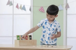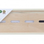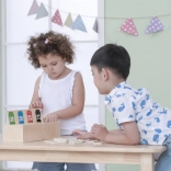 Zabawka uczy dzieci prawidłowej segregacji odpadów przy użyciu kolorowych, drewnianych płytek i oznaczonych kolorami koszy.