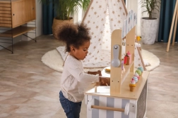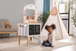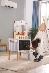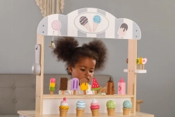 Ten drewniany zestaw stoiskowy działa jako sklep, cukiernia lub stoisko z lodami. Dzieci mogą odgrywać ulubione scenariusze dzięki wielu akcesoriom, takim jak lizaki, lody, wafle i polewy. Świetnym dodatkiem jest tablica do rysowania czy pisania dzisiejszego menu. Cały zestaw jest malowany nietoksycznymi farbami w delikatnych kolorach, które przyciągają dziecięcą uwagę.