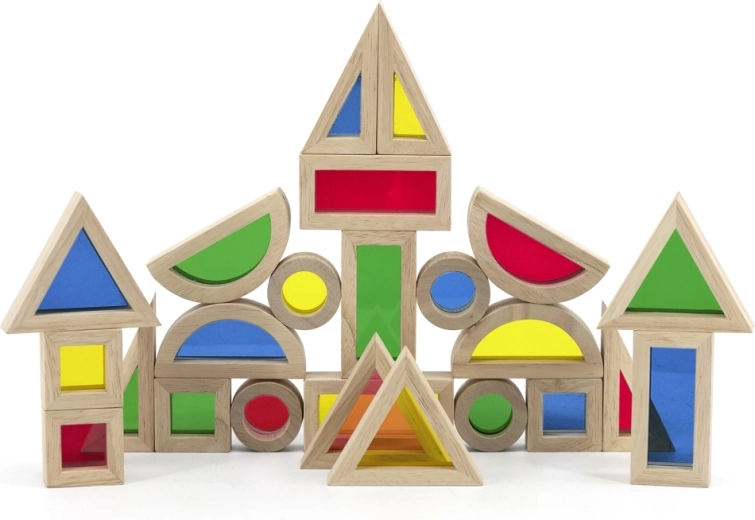 Klocki dostępne są w różnych kształtach i kolorach, co wspiera rozpoznawanie barw i form oraz percepcję wzrokową.