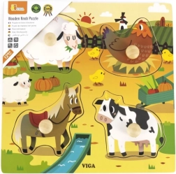 Ta drewniana układanka jest doskonałym wyborem dla rodziców, którzy chcą wspierać rozwój umiejętności motorycznych swojego dziecka. Oferuje piękne ilustracje zwierząt gospodarskich – owce, kurki, konie i krowy. Każdy element jest wyposażony w praktyczny guzik, umożliwiający łatwe uchwycenie i manipulację przez mniejsze rączki. Puzzle są zaprojektowane z myślą o bezpieczeństwie i trwałości, więc są idealne dla dzieci od 12 miesięcy.
