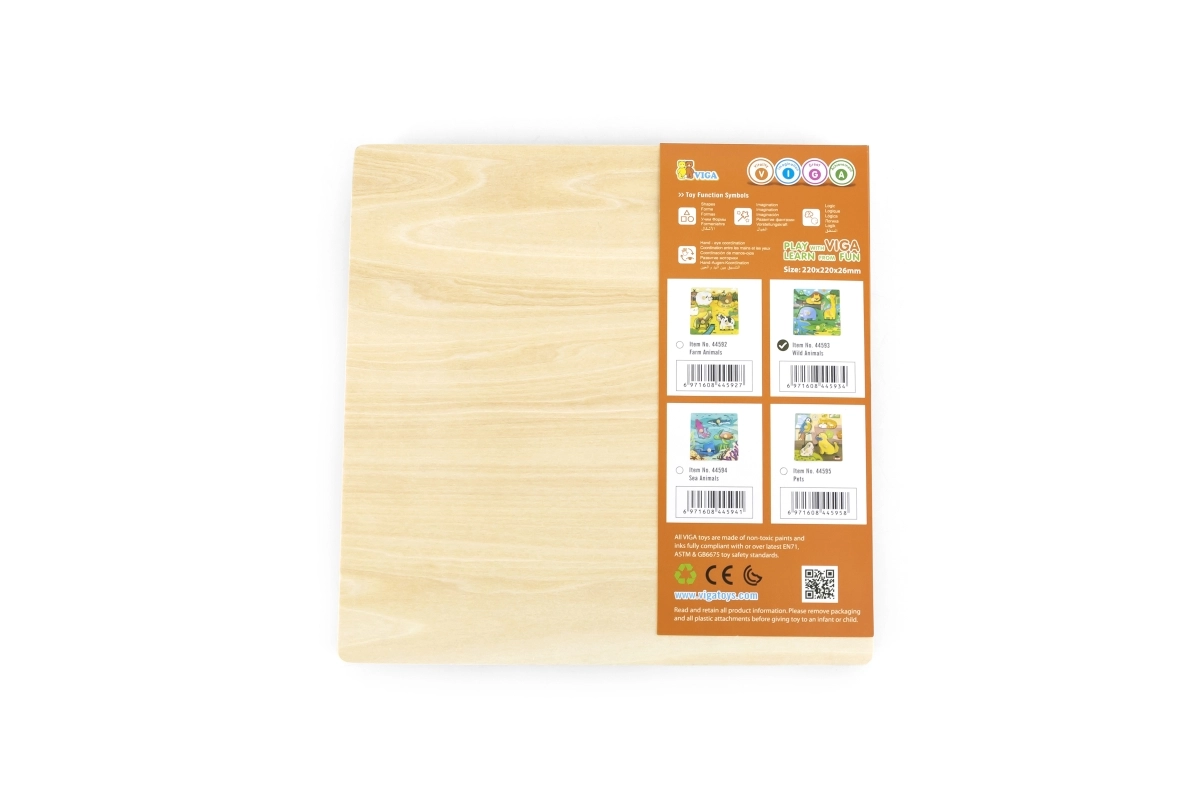 Drewniana układanka z dzikimi zwierzętami. Wymiary drewnianej planszy ok. 22,5 x 22,5 cm. Wymiary opakowania ok. 22,5 x 25,5 x 1 cm. Wiek 12m+