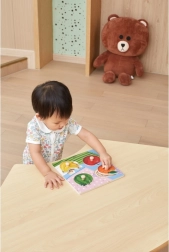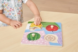 Puzzle zawierają elementy z uchwytami ułatwiającymi manipulację nawet najmłodszym dzieciom.