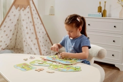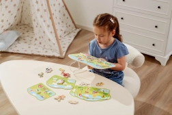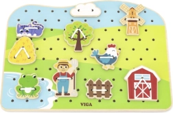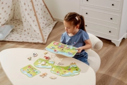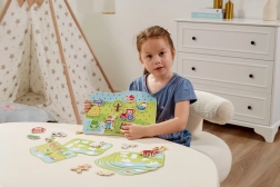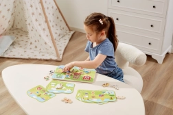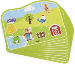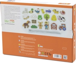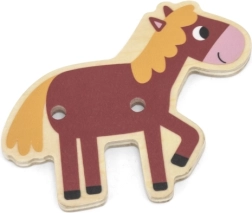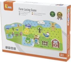 Ta przewlekanka o tematyce farmy to idealna pomoc w rozwoju umiejętności przedszkolaków. Dzieci, kierując się wzorami lub własną wyobraźnią, przewlekają sznureczki przez kolorowe drewniane elementy, wzmacniając palce, poprawiając chwyt i przygotowując się do pisania oraz rysowania.