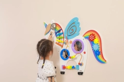 Ta multifunkcyjna tablica ścienna w formie jednorożca łączy elementy muzyczne, dotykowe i logiczne w jedną atrakcyjną całość. Dzieci zagrają na ksylofonie, zakręcą kołami zębatymi, wypróbują magnetyczny labirynt i lusterka, a także poćwiczą rozpoznawanie kolorów, kształtów i koordynację ruchów.