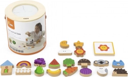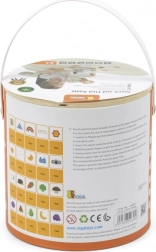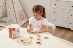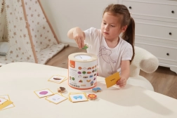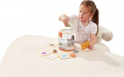 Gra Złap i znajdź. Zestaw zawiera 20 klocków, papierowe wiaderko, 20 kart do gry oraz pokrywkę. Wymiary opakowania ok. 16 × 15,5 cm. Wiek 3+