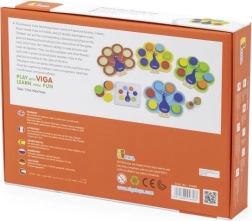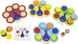 W zestawie znajduje się 4× drewniana plansza pawia, 36 krążków w 6 kolorach, 20 dwustronnych kart z zadaniami oraz 2 kostki z kolorami. Gra wspiera samodzielną i zespołową aktywność oraz świetnie przygotowuje do edukacji przedszkolnej.