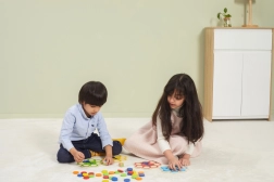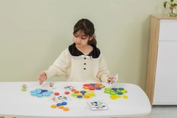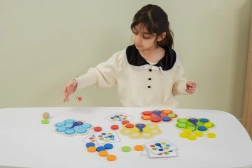 Dzieci dopasowują krążki według kart lub wyniku rzutu kostką, naturalnie przyswajając kolory oraz trenując uwagę i logiczne myślenie.