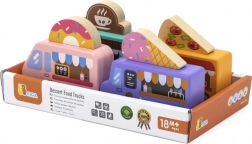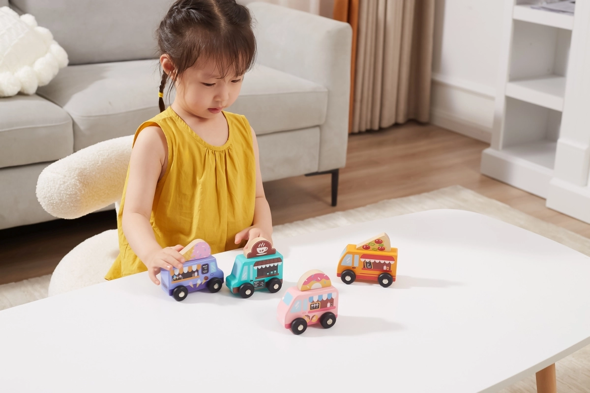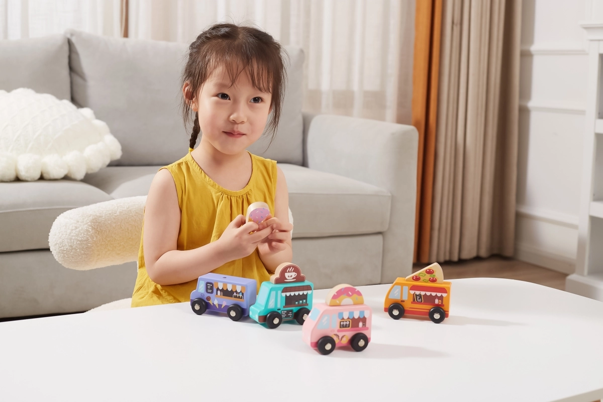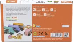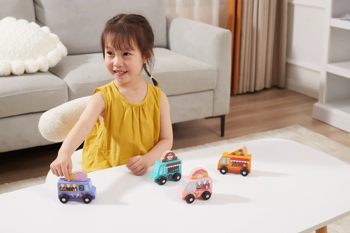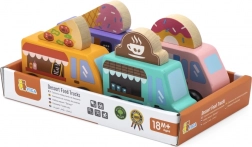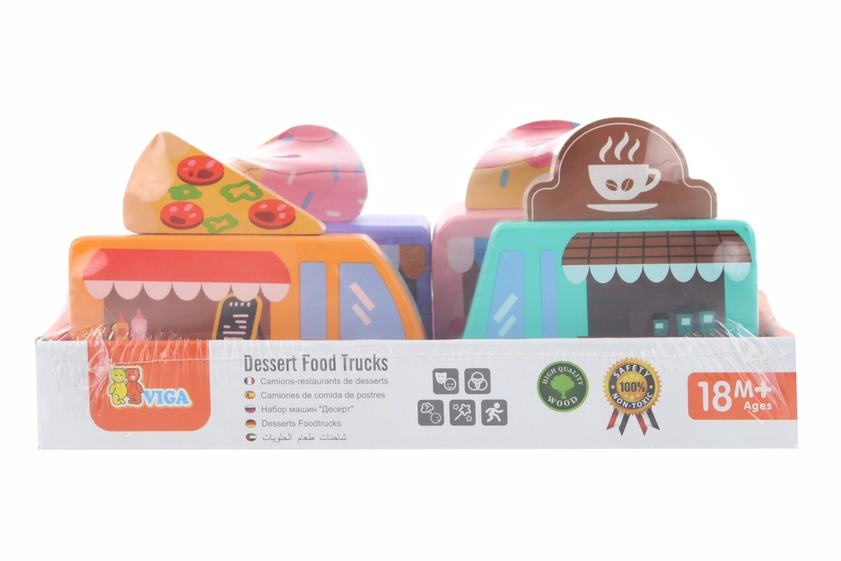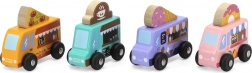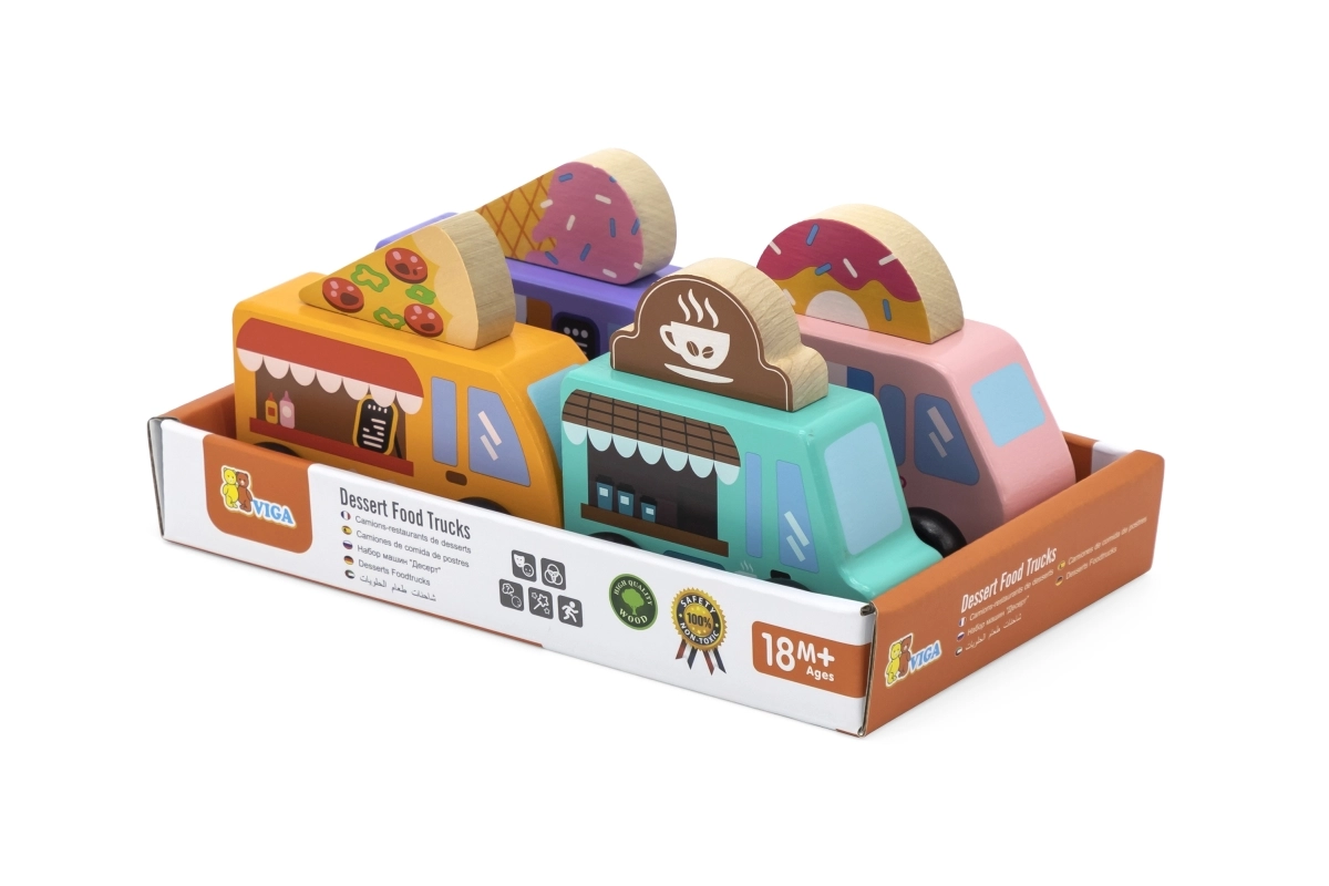 Drewniany zestaw food trucków Viga to cztery urocze pojazdy na kółkach w pastelowych kolorach z dopracowanymi nadrukami. Każdy truck ma tematyczny baner – pizza, kawa, lody i donuty – który można dowolnie wymieniać, dzięki czemu dzieci tworzą własne historie i stanowiska. Wysokiej jakości drewno i nietoksyczne farby zapewniają bezpieczną i długotrwałą zabawę.