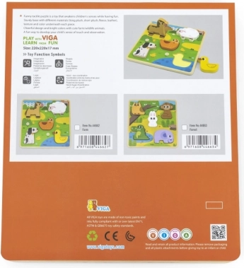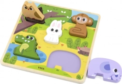 Drewniana układanka VIGA z leśnymi zwierzątkami to idealne pierwsze puzzle dla najmłodszych. Zadaniem jest poprawne dopasowywanie kształtów zwierząt do wyznaczonych otworów na kolorowej podstawie. Elementy wygodnie leżą w rączkach, a solidna drewniana konstrukcja zapewnia długie użytkowanie.