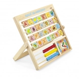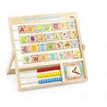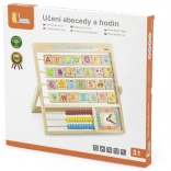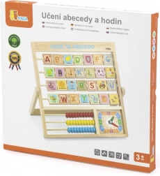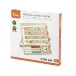 Drewniany alfabet i zegar w języku czeskim. Dzieci mogą uczyć się liter, liczb oraz zdobyć ogólne pojęcie o odczytywaniu godziny. Każda litera ma na odwrocie słowo ułatwiające zapamiętywanie. Wymiary ok. 32,5 x 32 x 2,3 cm. Wymiary opakowania ok. 34 x 32,5 x 3 cm. Wiek 3+