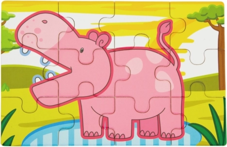 Proste kształty i wyraziste kolory lwa, słonia, hipopotama i małpki motywują dzieci do układania i wspierają percepcję wzrokową.