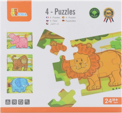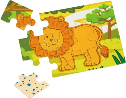 Ten zestaw drewnianych puzzli z wesołymi zwierzątkami z dżungli ucieszy każde dziecko. Każdy motyw ma żywe kolory i proste kształty, które ułatwiają układanie i naturalnie rozwijają dziecięcą wyobraźnię. Z elementów można ułożyć zarówno cztery oddzielne obrazki, jak i jeden długi panoramiczny motyw wszystkich zwierzątek.