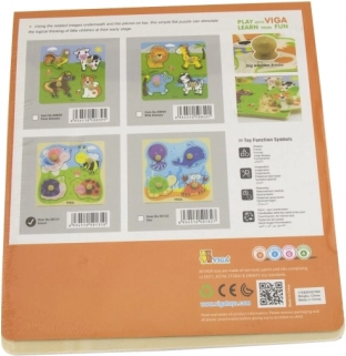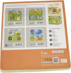 Drewniana układanka VIGA z 4 dużymi elementami z uchwytami to idealne pierwsze puzzle dla najmłodszych. Kolorowe motywy owadów i zwierzątek z łąki naturalnie motywują dzieci do odkrywania i nauki. Frezowane krawędzie na solidnej drewnianej podstawie pomagają, by każdy element pewnie trzymał się na swoim miejscu.