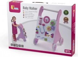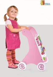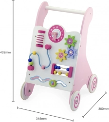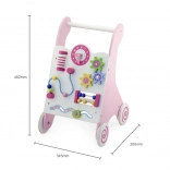 Chodzik wyposażony jest w gumowe kółka, które zapobiegają ślizganiu się i zapewniają bezpieczeństwo podczas chodzenia. Cała zabawka wykonana jest z lakierowanego drewna, co zapewnia ciepły i naturalny dotyk, a jednocześnie jest bardzo odporne na zużycie. Zapakowana w kolorowe pudełko z uchwytami, jest idealna jako prezent.