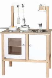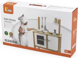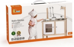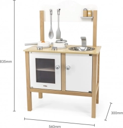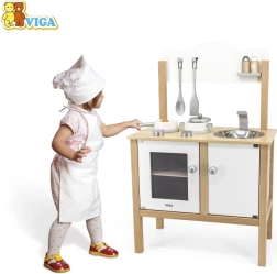 Drewniana dziecięca kuchnia marki Viga jest idealna dla małych kucharzy, którzy chcą naśladować gotowanie. Ta drewniana konstrukcja z nowoczesnym białym i naturalnym drewnianym wykończeniem jest trwała i stylowa, dzięki czemu pasuje do każdego pokoju dziecięcego.