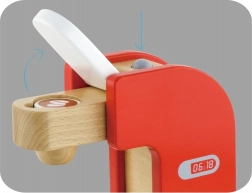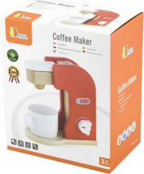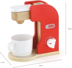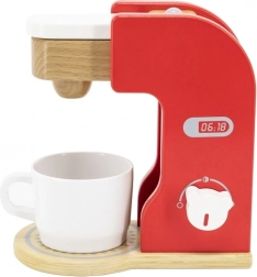 Czerwony ekspres do kawy z naturalnymi drewnianymi akcentami, który imituje prawdziwe urządzenie i oferuje zabawne doświadczenie z gry.