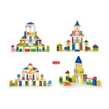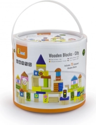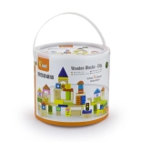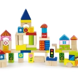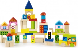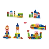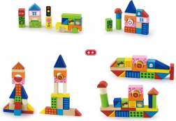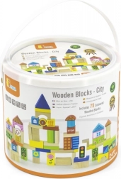Zestaw zawiera klocki różnej wielkości, od 2,5 cm do 7,5 cm, co pozwala dzieciom tworzyć różne budowle, takie jak domy, mosty i inne miejskie elementy. Dzięki wytrzymałemu drewnianemu materiałowi klocki są odpowiednie do długotrwałej i bezpiecznej zabawy.