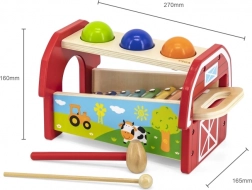 - podstawa z pojemnikiem na kulki, ksylofon, drewniany młotek, 3 kolorowe kulki