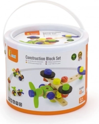 Ten drewniany zestaw konstrukcyjny to idealny wybór na pierwsze techniczne budowanie. Dzieci mogą tworzyć własne projekty według wyobraźni lub inspirować się dołączoną broszurą z obrazkowymi instrukcjami. Kompaktowe wiaderko z uchwytem ułatwia przenoszenie i przechowywanie, dzięki czemu zestaw jest zawsze pod ręką, a elementy się nie gubią.
