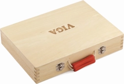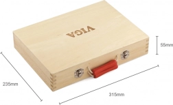 Solidny drewniany kuferek z metalowymi zatrzaskami i czerwonym uchwytem utrzymuje wszystko na swoim miejscu, dzięki czemu żaden element się nie zgubi. Dzięki przejrzystemu ułożeniu każde narzędzie ma swoje miejsce, a cały zestaw jest łatwy do przenoszenia w podróży, na wycieczki i do dziecięcego pokoju.