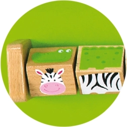 Trzy graniastosłupy z ilustracjami zwierząt dzieci obracają i układają w poprawny obrazek – ćwiczą logikę, cierpliwość i percepcję wzrokową.