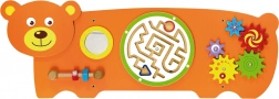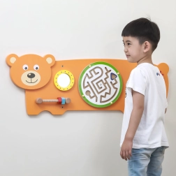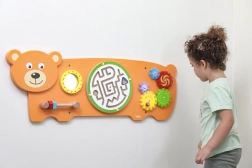 Tablica sensoryczna Miś została zaprojektowana zgodnie z zasadami Montessori tak, by naturalnie motywować dzieci do odkrywania i ćwiczenia umiejętności. Oferuje wiele aktywności: obracanie kół zębatych, prowadzenie kuleczki w labiryncie, obserwację w bezpiecznym lusterku oraz trening chwytu dzięki śrubkom na gwincie. Dzięki solidnej drewnianej konstrukcji i możliwości montażu na ścianie świetnie sprawdzi się w pokojach dziecięcych, salach zabaw i przedszkolach.