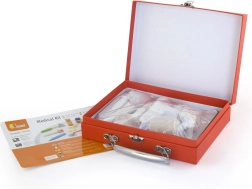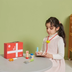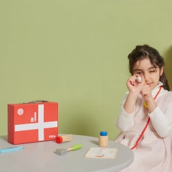 Ten piękny zestaw lekarski w solidnej drewnianej walizce ucieszy wszystkie małe lekarki i lekarzy. Dzieci mogą posłuchać serduszka stetoskopem, „zmierzyć” temperaturę termometrem, podać zastrzyk lub wypełnić kartę pacjenta dla pluszaków i lalek. Zabawa w lekarza to wciągająca aktywność odgrywania ról, która rozwija umiejętności społeczne, wrażliwość i empatię.