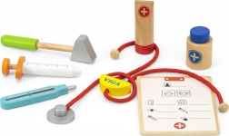 - Zawartość zestawu: stetoskop, termometr, strzykawka, młoteczek odruchowy, tuba maści, karta pacjenta, syrop, drewniana lekarska walizka