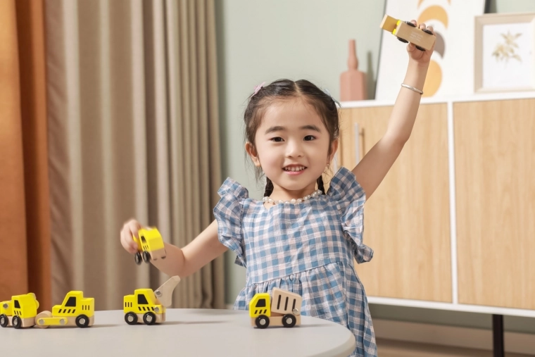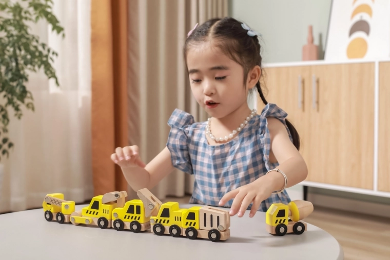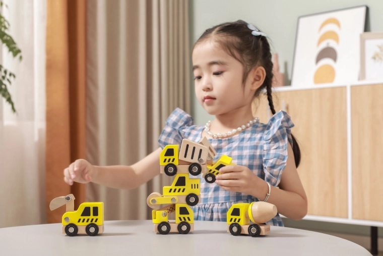 Każdy pojazd ma funkcyjne kółka do płynnego toczenia, a niektóre części sugerują ruchome elementy (np. łyżka, betoniarka czy żuraw), co pobudza naturalną ciekawość i rozwój koordynacji oko–ręka.