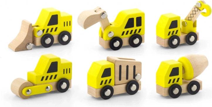 Ten wysokiej jakości zestaw zawiera 6 różnych pojazdów budowlanych w intensywnym żółtym kolorze z naturalnymi drewnianymi elementami – idealny do pierwszych wyścigów po podłodze i zabaw w plac budowy. Dzięki zaokrąglonym kształtom i wytrzymałej drewnianej konstrukcji autka są bezpieczne i przyjemne w dotyku.