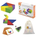 Odkryj zabawną logiczną grę dla dzieci – drewniany tangram od VIGA. Kolorowe geometryczne elementy i karty ze wzorami wspierają logiczne myślenie, kreatywność i motorykę małą. Wysokiej jakości drewno z certyfikatem FSC i nietoksyczne farby zapewniają bezpieczną zabawę, podczas której dzieci ćwiczą koncentrację oraz rozpoznawanie kolorów i kształtów w duchu zasad Montessori.